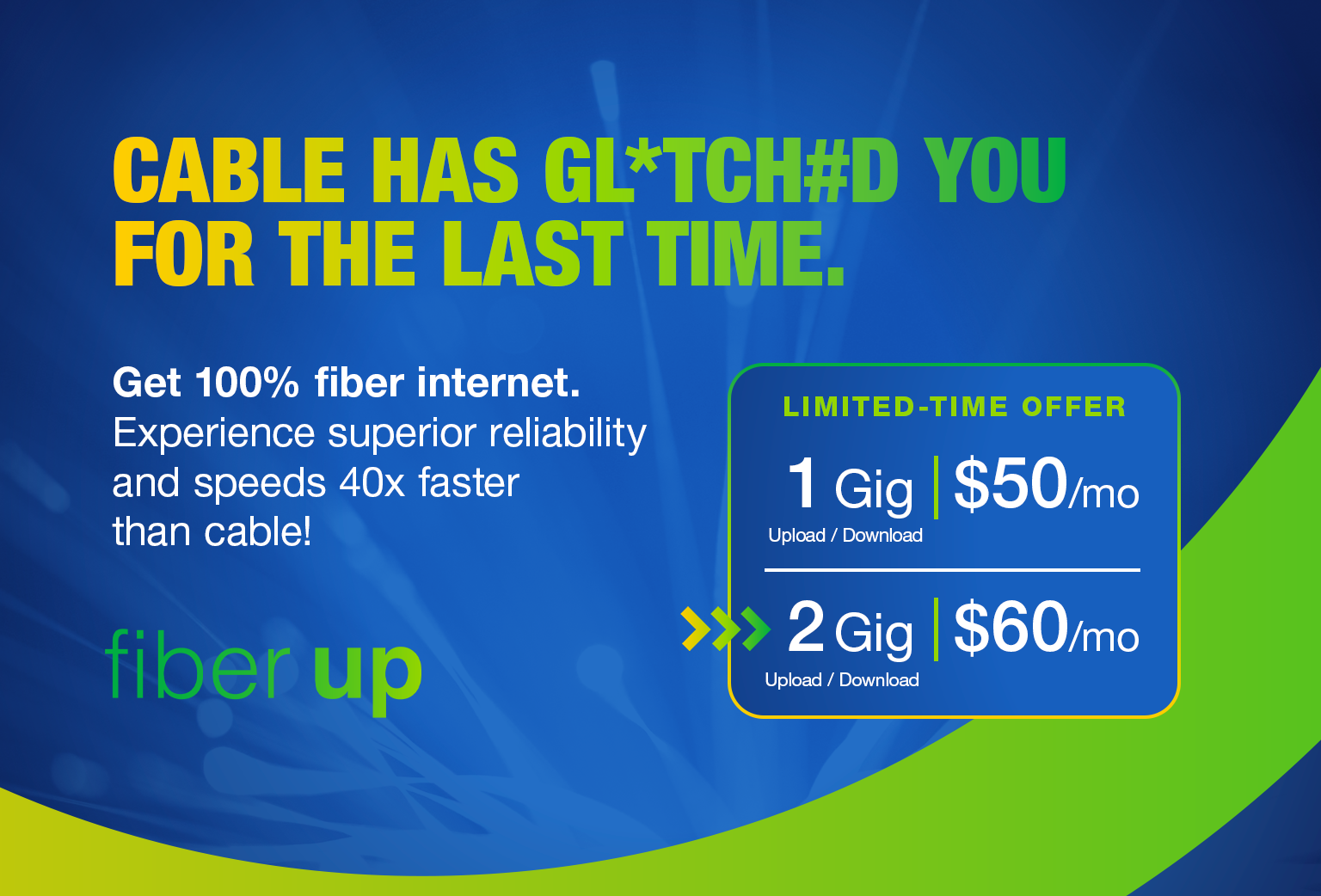 Say goodbye to cable’s unreliable internet, buffering and peak-time slowdowns. All Fidium plans include free professional install, no contracts and no data caps. Whole-home WiFi and advanced features included with 1 Gig or 2 Gig.