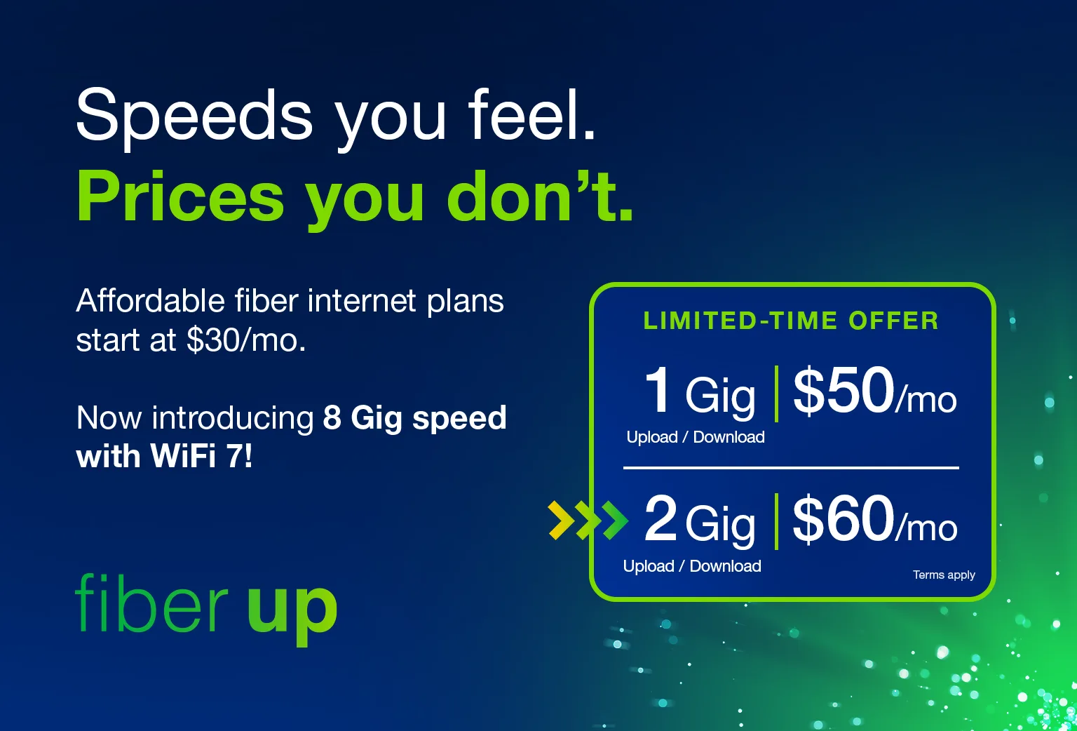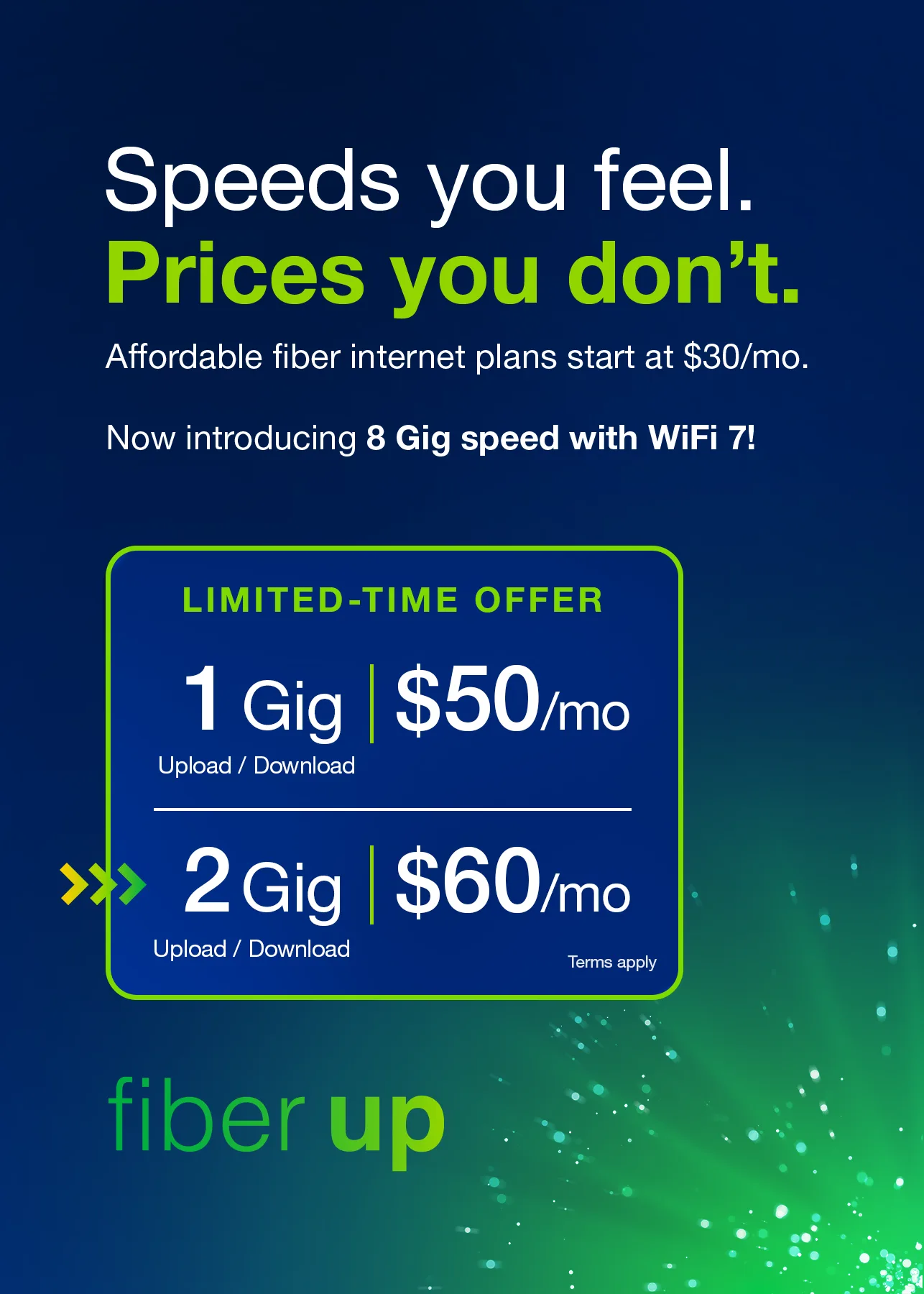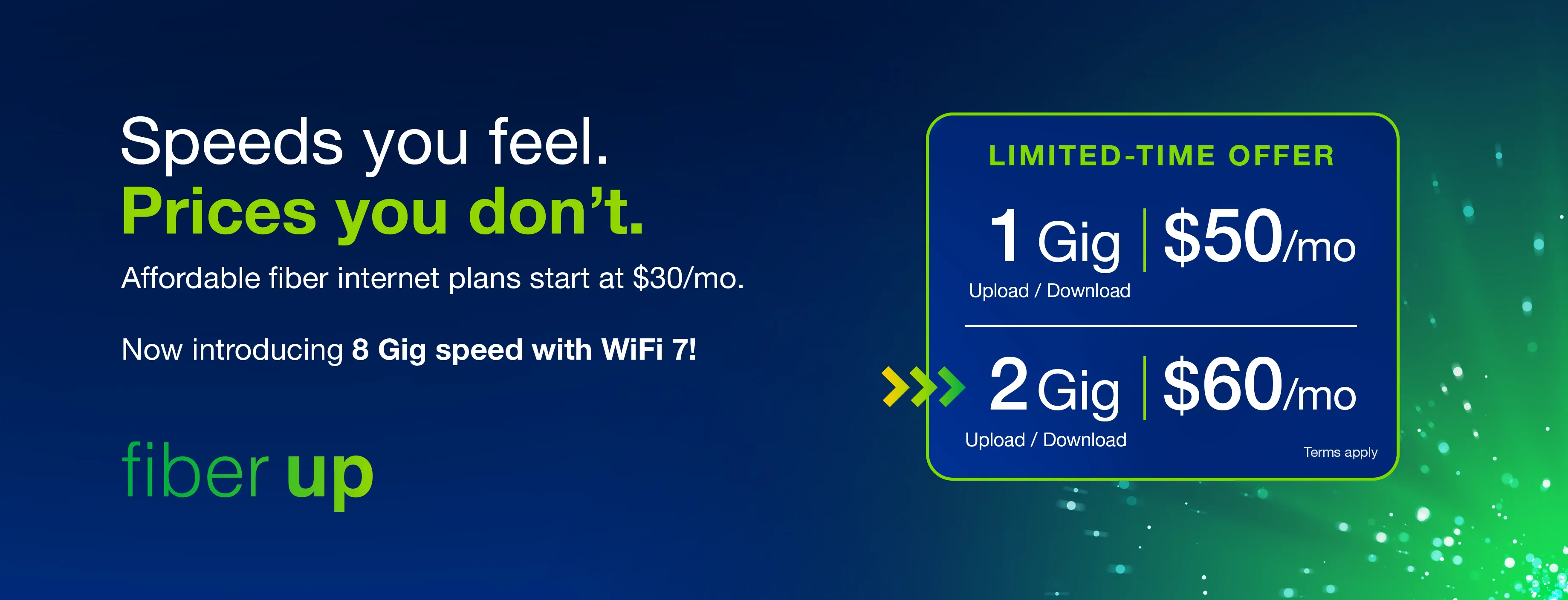 Say goodbye to cable’s unreliable internet, buffering and peak-time slowdowns. All Fiber Internet plans include free professional install, no contracts and no data caps. Whole-home WiFi and advanced features included with 1 Gig or 2 Gig.