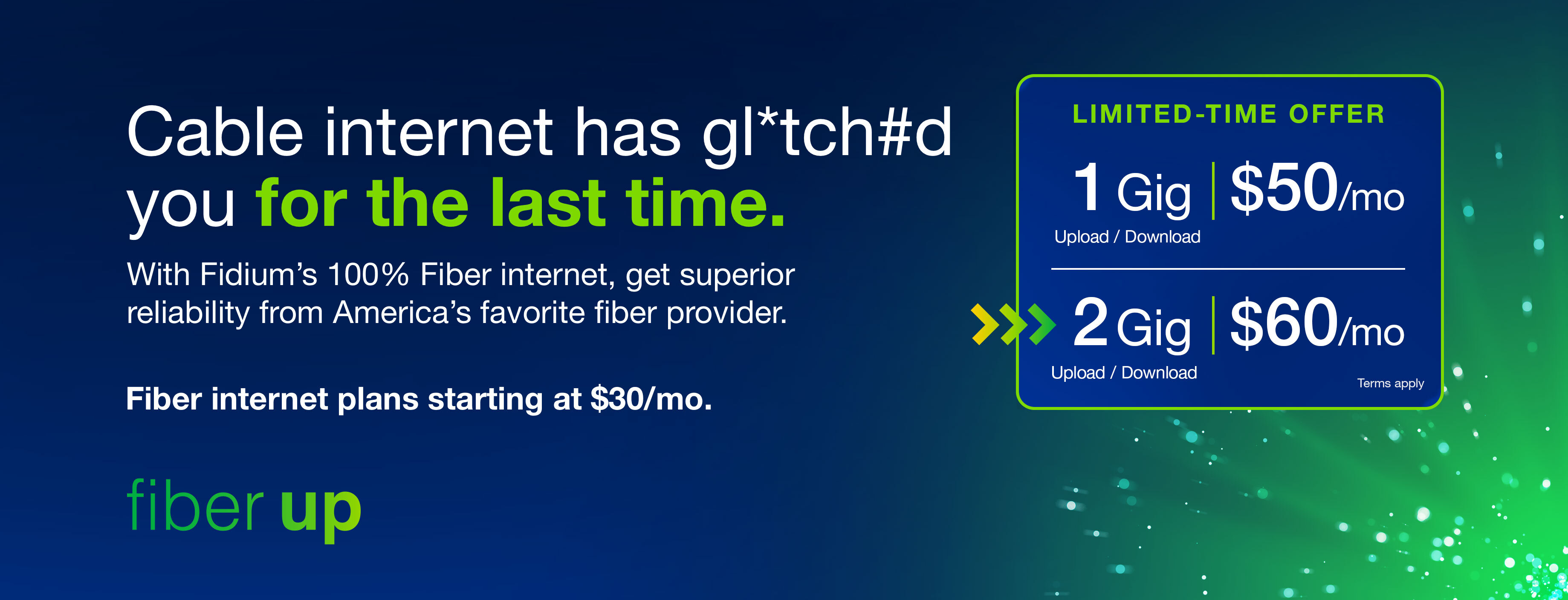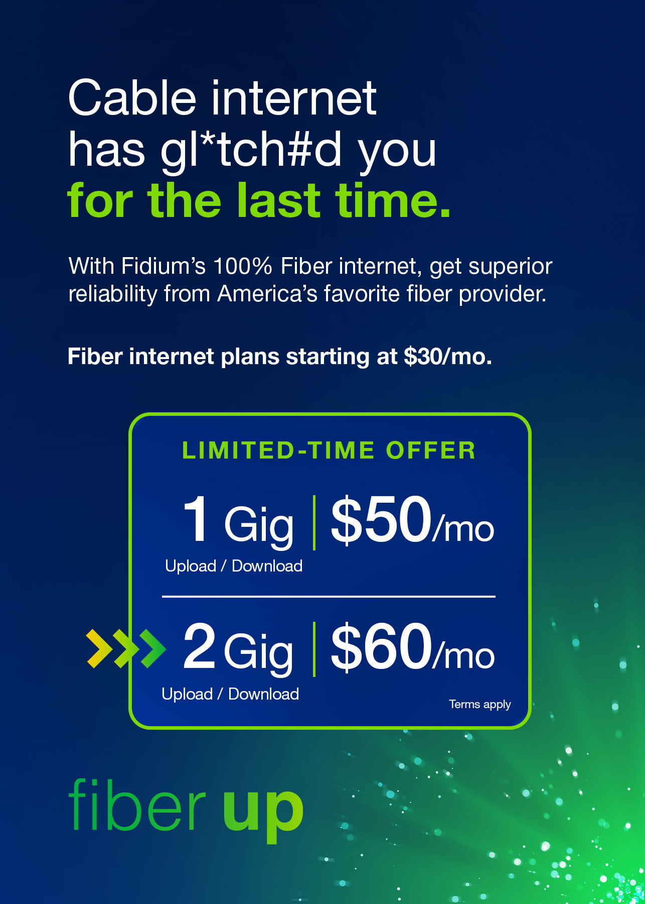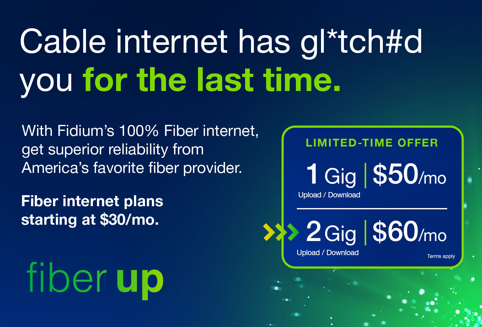 Say goodbye to cable’s unreliable internet, buffering and peak-time slowdowns. All Fiber Internet plans include free professional install, no contracts and no data caps. Whole-home WiFi and advanced features included with 1 Gig or 2 Gig.
