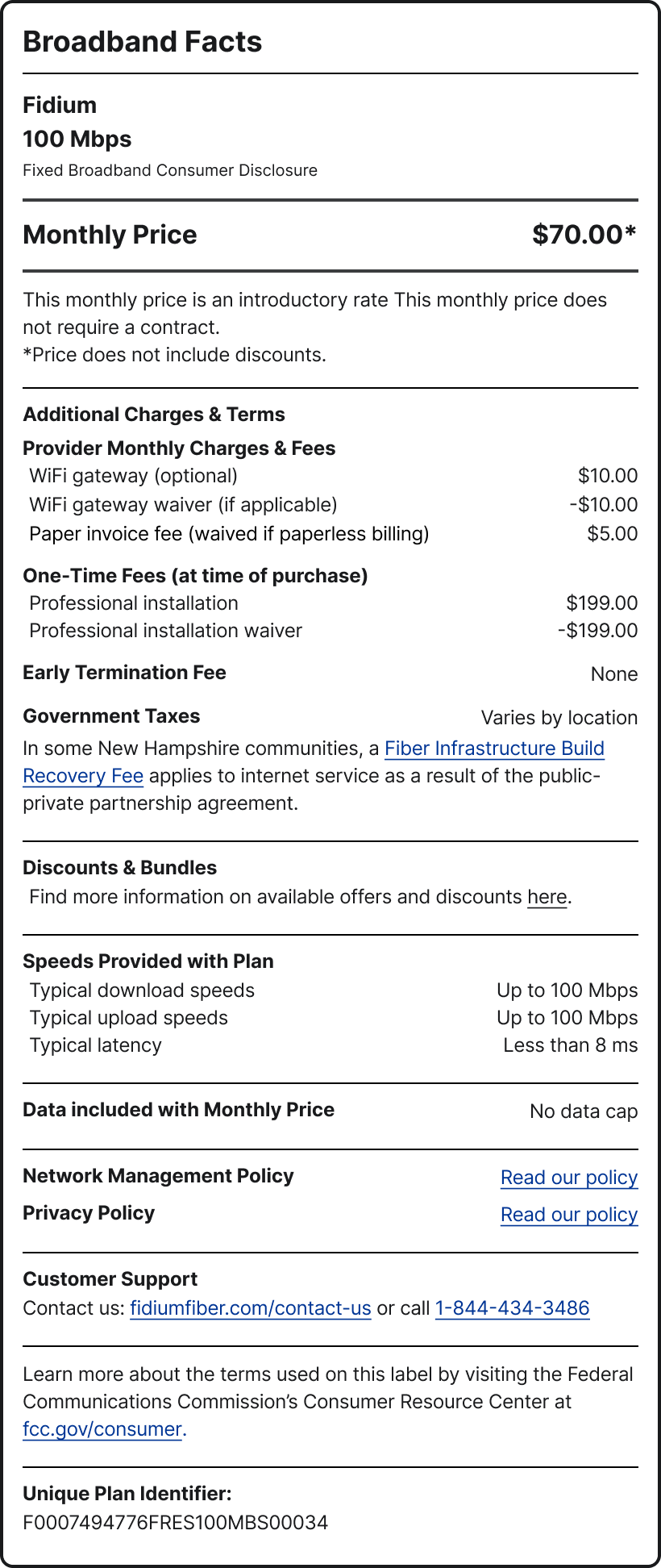 In some New Hampshire communities, a Fiber Infrastructure Build Recovery Fee applies to internet service as a result of the public-private partnership agreement.