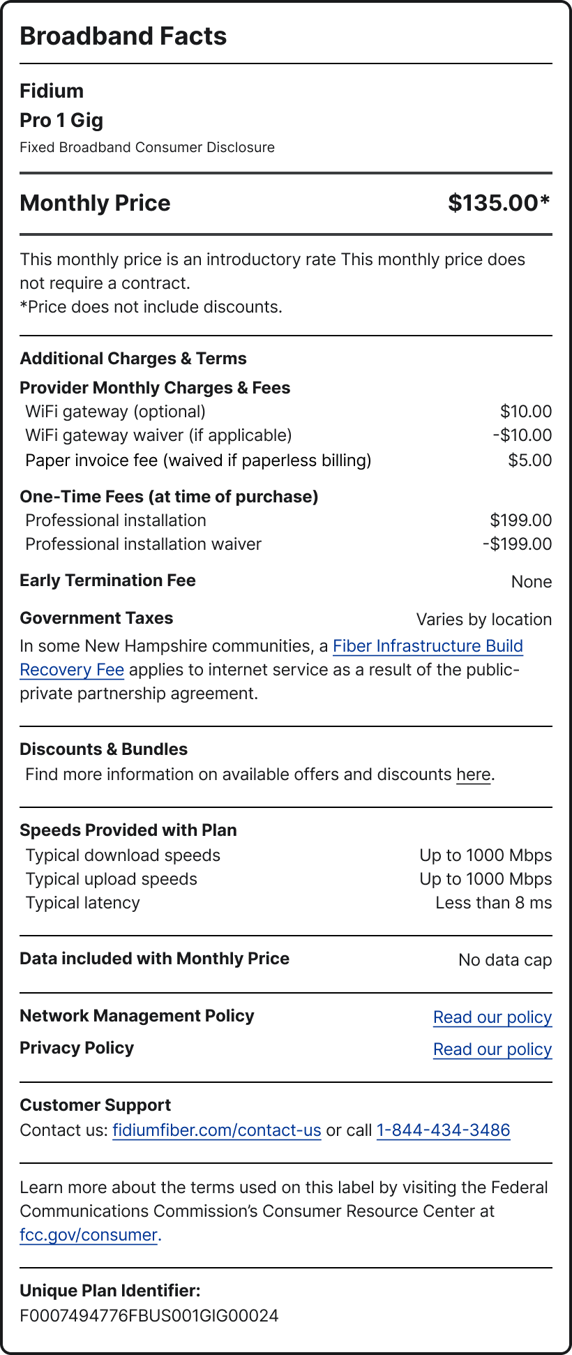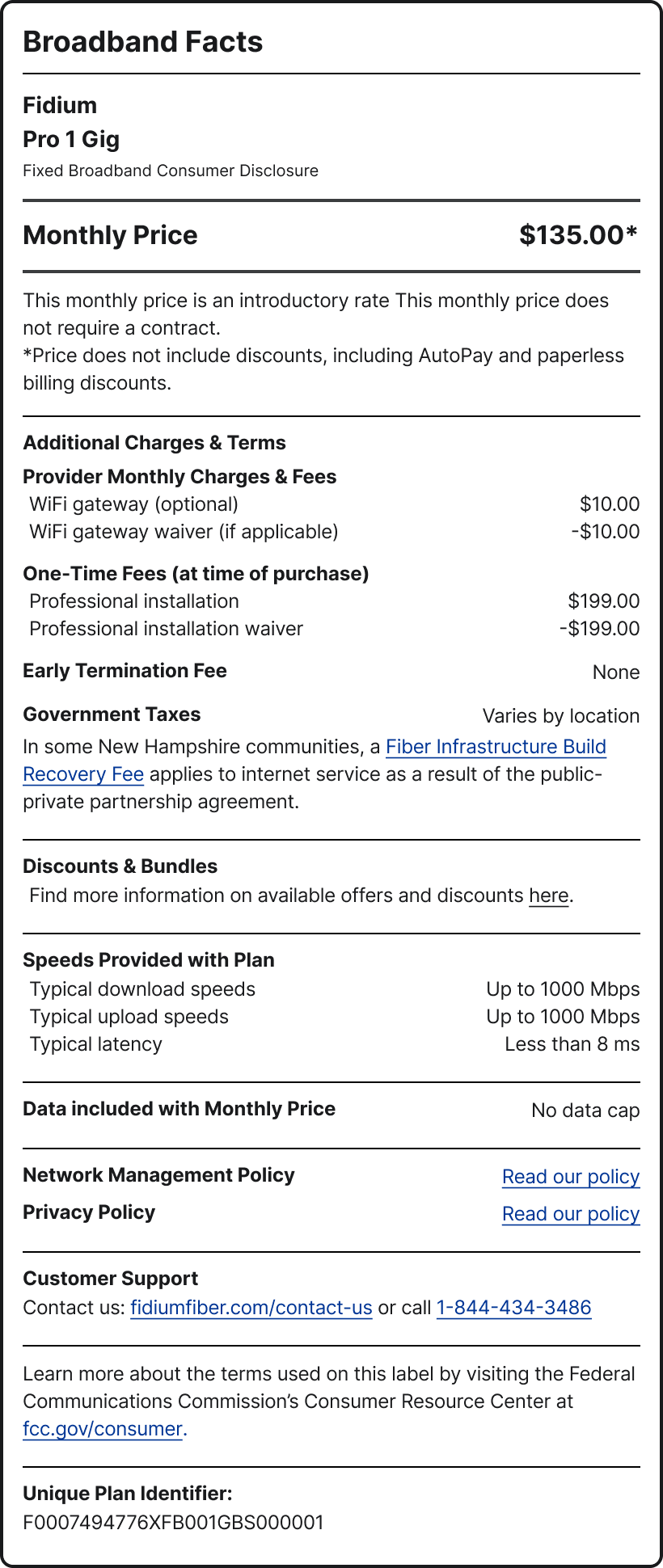 In some New Hampshire communities, a Fiber Infrastructure Build Recovery Fee applies to internet service as a result of the public-private partnership agreement.
