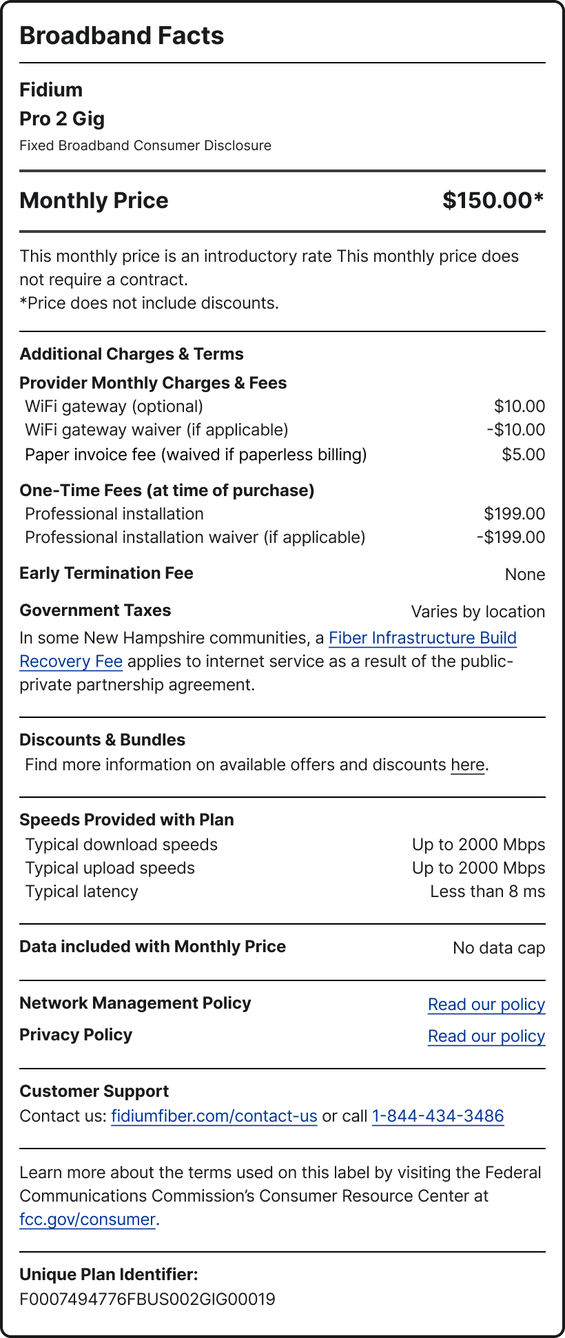 In some New Hampshire communities, a Fiber Infrastructure Build Recovery Fee applies to internet service as a result of the public-private partnership agreement.