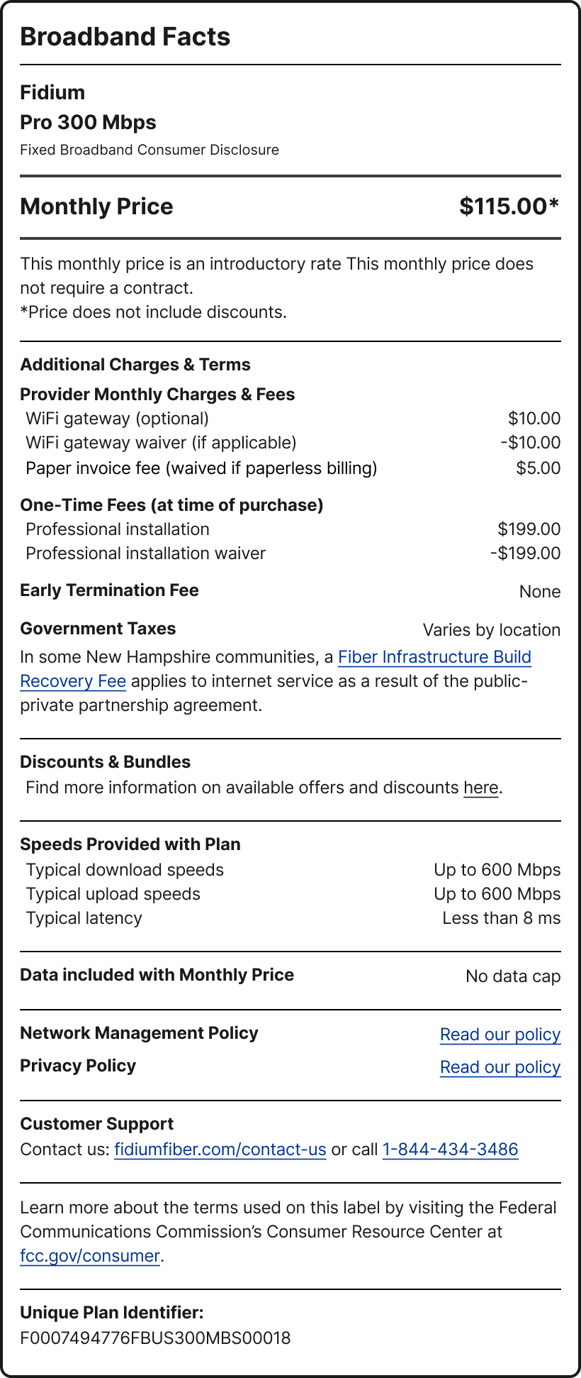 In some New Hampshire communities, a Fiber Infrastructure Build Recovery Fee applies to internet service as a result of the public-private partnership agreement.