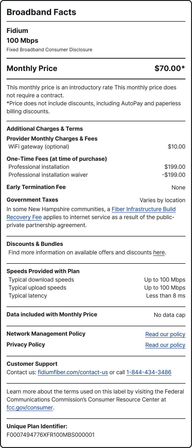 In some New Hampshire communities, a Fiber Infrastructure Build Recovery Fee applies to internet service as a result of the public-private partnership agreement.