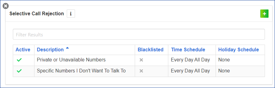 To prevent receiving calls from specific numbers, you must create a new policy, by clicking the green plus icon right of the Selective Call Rejection heading.